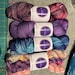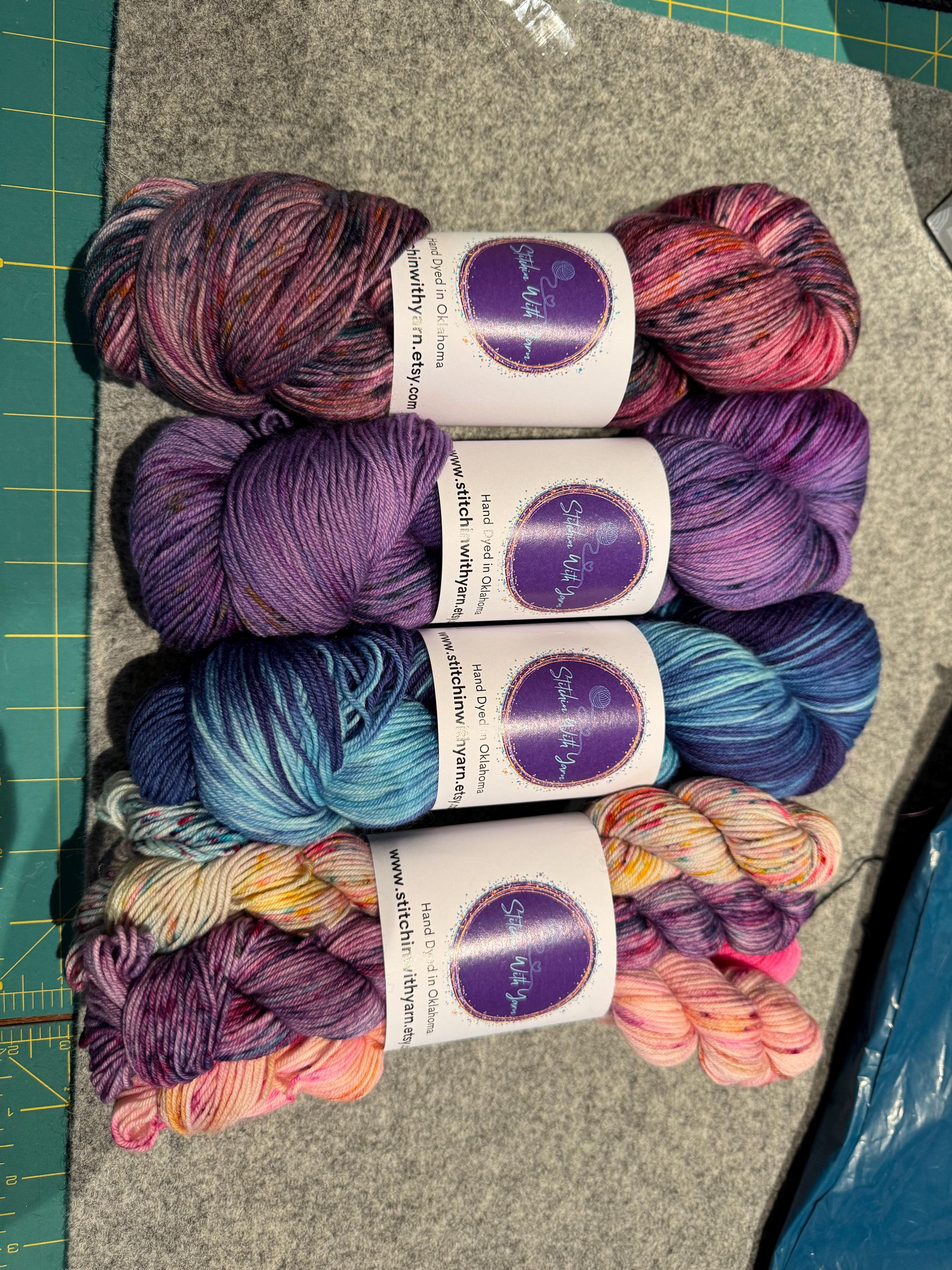 These skeins are all hand dyed by me that were either trials/testing out colorways/swatching dye colors or just creating one of a kind colorways. You will receive 3 mystery skeins (300grams total) of hand dyed sock yarn.