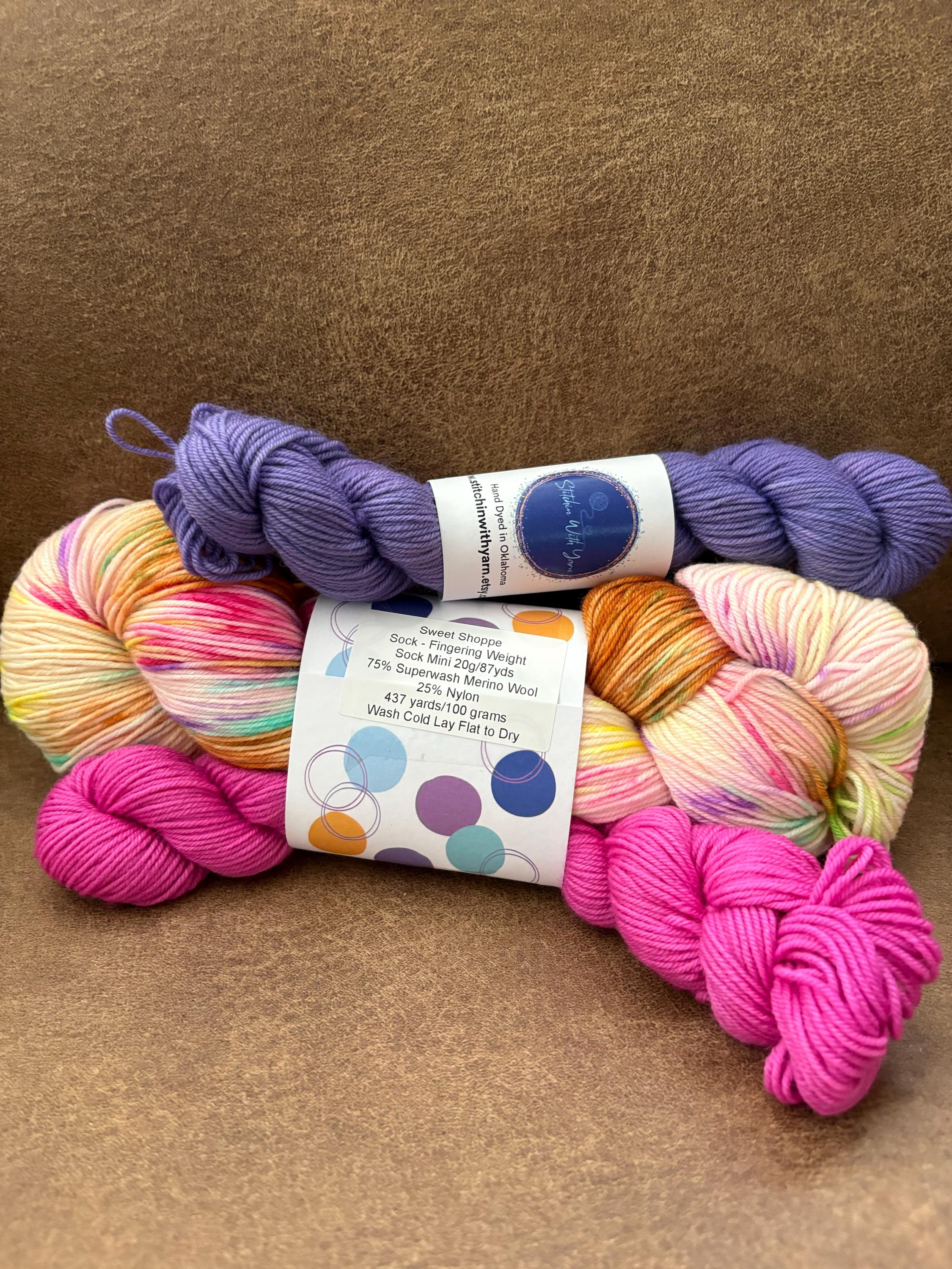 Sock Set 2 Minis - 100g/437 yards 75% Superwash Merino Wool 25% Nylon Yarn with two 20 gram mini skeins in Gumdrop and Iris. A go to durable sock yarn that feels great against the skin and is soft and springy.